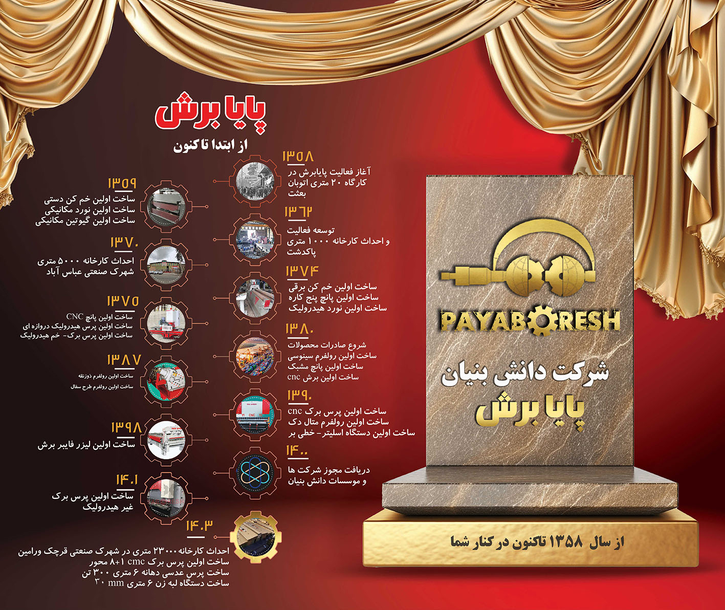 صنایع ماشینسازی پایابرش از سال 1358 تا کنون در زمینه تولید ماشینآلات برش و فرمدهی فلزات در حال فعالیت است. مأموریت پایابرش طراحی، تولید و تأمین ماشینآلات صنعتی پیشرفته برش و فرمدهی، دستگاههای گیوتین، CNC و لیزر مطابق با استانداردهای ملی و بینالمللی در ایران و خاورمیانه میباشد. ما خواهیم توانست برای مشتریان، تامین کنندگان و صاحبان صنایع (داخلی و خارجی) ارزشهای پایدار ایجاد نماییم.