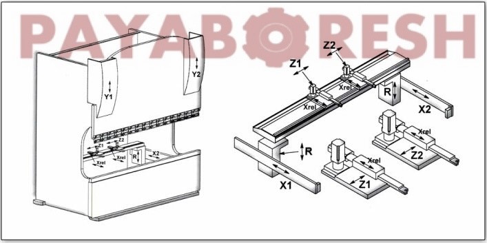 به عنوان یک محور مختصات به سمت بالا و پایین و چپ و راست (انتخابی) جلو و عقب حرکت میکند و یک پرس برک چهار محوره داریم و وظیفه آن نگهداری ورق در مختصات مورد نیا در جهت خم کاری است.